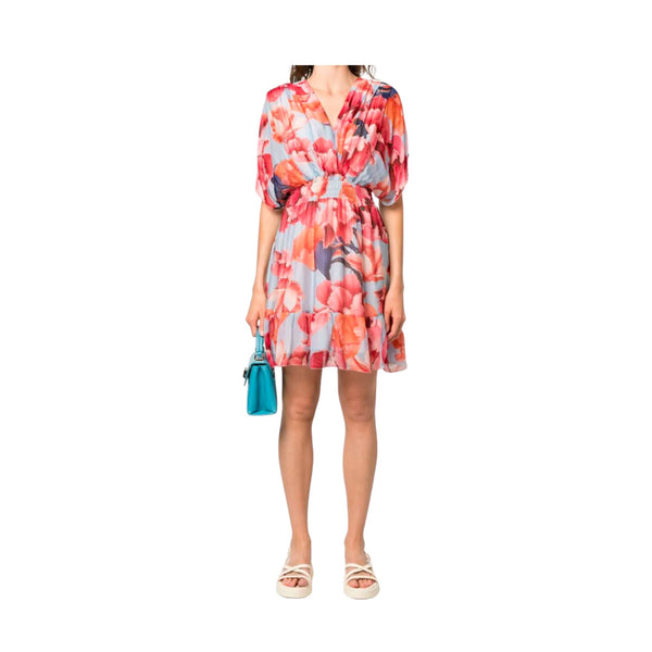 This short dress in printed viscose signed Liu Jo is made entirely from a superior quality viscose blend, offering a feeling of softness and elegance. The fit is dynamic and versatile, thanks to the back lace closure, V-neckline, gathered hem and short sleeves. The elastic waistband allows for a comfortable fit.