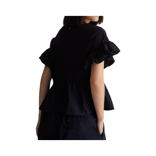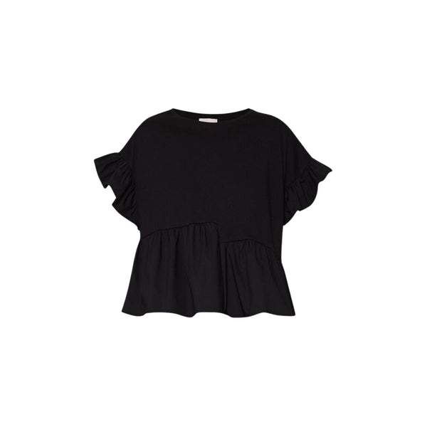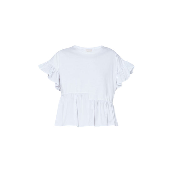 Discover the Liu Jo Women's T-shirt ! Made of soft, solid-colored cotton, perfect for an unparalleled style. The look is made unique by short sleeves with flounces and an asymmetrical flounce at the bottom. A must-have for everyone!