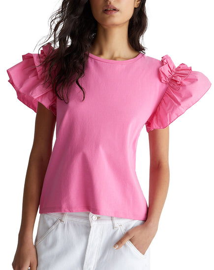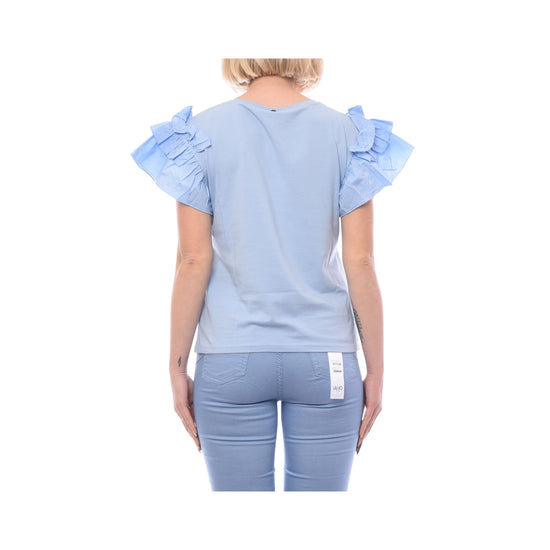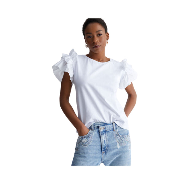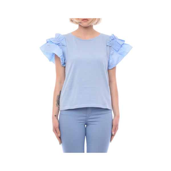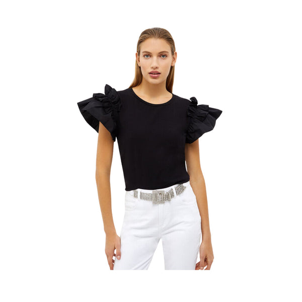 Stretch cotton jersey T-shirt. Cotton poplin sleeves. Crew neck cut. Cap sleeves finished with ruffles. Metal logo on the back. Made in Italy. The model is 178 cm tall and wears size S. Composition: 95% cotton, 5% elastane