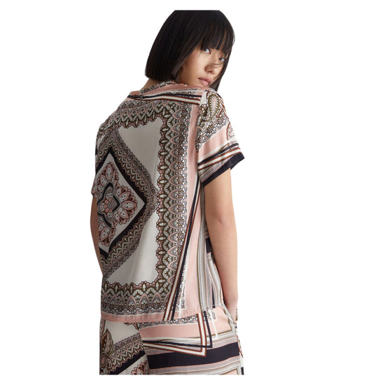 This women's T-shirt by Liu-jo features a beautiful pattern with a colorful pattern, featuring a satin material fabric. The print is arranged all over the garment, the neckline is round and the short sleeves give a touch of summer character to the garment Details Composition: 100% polyester Satin T-shirt All-over floral print Round neckline Short sleeves Metal logo on the back Code WA3022T5958