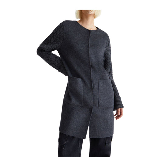 Manteau pour femme de Liu Jo en laine mélangée. Doté d'un travail en tricot torsadé dans le dos, sur l'encolure et le col rond, de poches avant et d'une fermeture boutonnée sur le devant. Un vêtement chaud et polyvalent, idéal pour la saison à venir.
