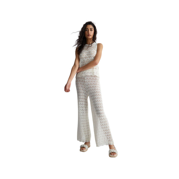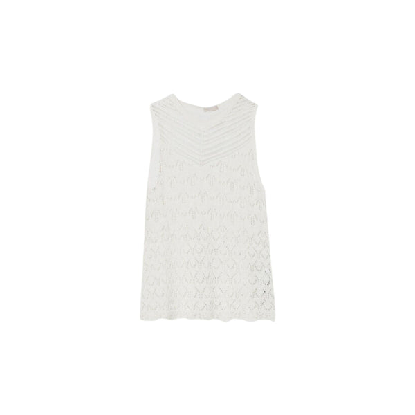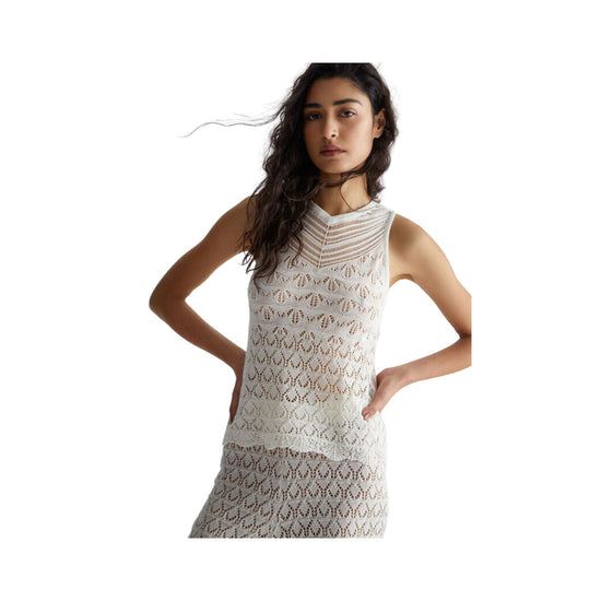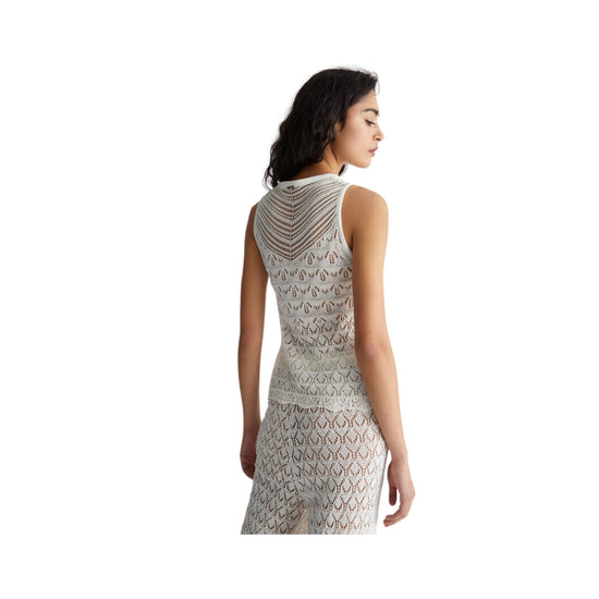 Haut en tricot de coton éco-durable avec travail graphique à effet transparent. Col V soutenu par de larges bretelles. Logo en métal au dos. Bords côtelés. Produit durable « Liu Jo Better ». Le mannequin mesure 178 cm et porte une taille S. Composition : 64% coton, 36% polyamide
