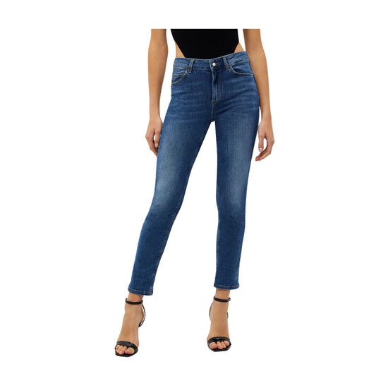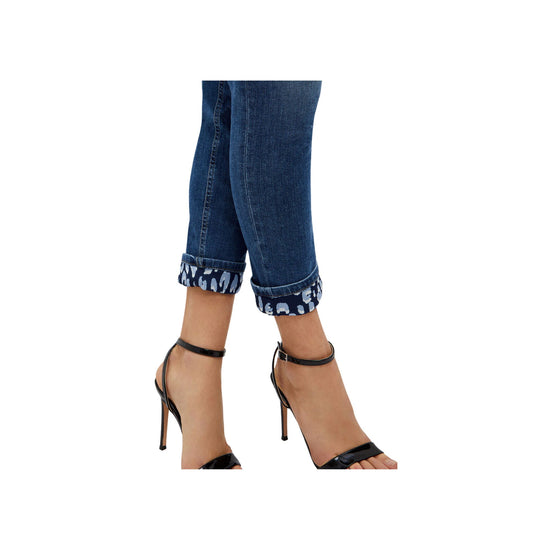 Jean pour femme Liu Jo en coton stretch, équipé de cinq poches, passants de ceinture et revers avec motif animalier. Un jean confortable et polyvalent pour tous les jours. Complétez le look avec un t-shirt et des baskets.
