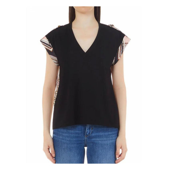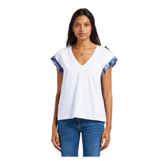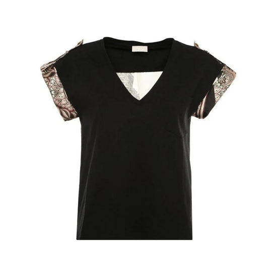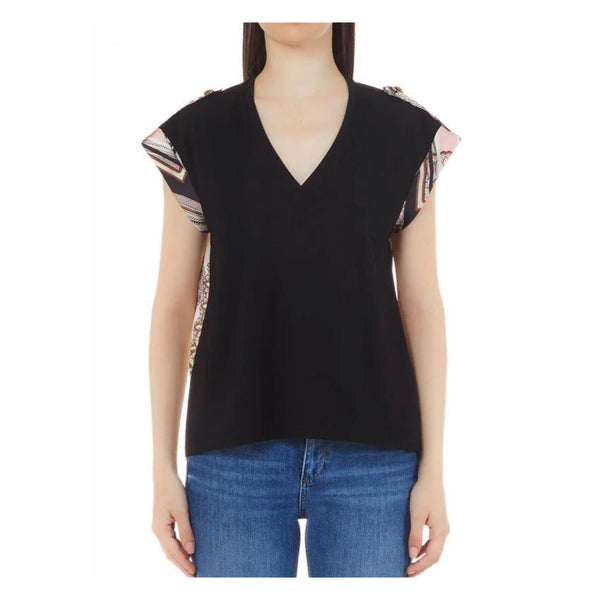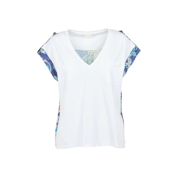 T-shirt pour femme de Liu Jo en coton avec dos foulard. Le vêtement en jersey de coton stretch, disponible en deux couleurs, présente un empiècement en satin avec imprimé foulard au dos. Le modèle présente une encolure en V avec une poche plaquée sur la poitrine, des manches courtes et un logo en métal au dos. T-shirt confortable et polyvalent, associé à un jean ou un pantalon élégant, il est parfait en toute occasion. Détails Composition: 95% Coton 5% Élasthanne Imprimé foulard Col V Insert en satin Poche poitrine Coupe: Regular Cod.