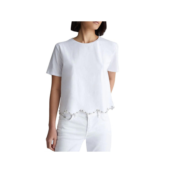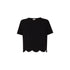 T-shirt femme Liu Jo entièrement en coton stretch pour vous offrir un maximum de douceur et de confort. Un t-shirt à manches courtes avec un ourlet ondulé avec des strass appliqués.