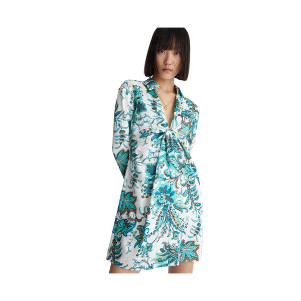 Abito Donna corto firmato Liu Jo è un capo di classe che non passa inosservato. Realizzato con una fantasia paisley unica e con uno scollo a v e un nodo sul davanti, questo abito valorizza qualsiasi look.