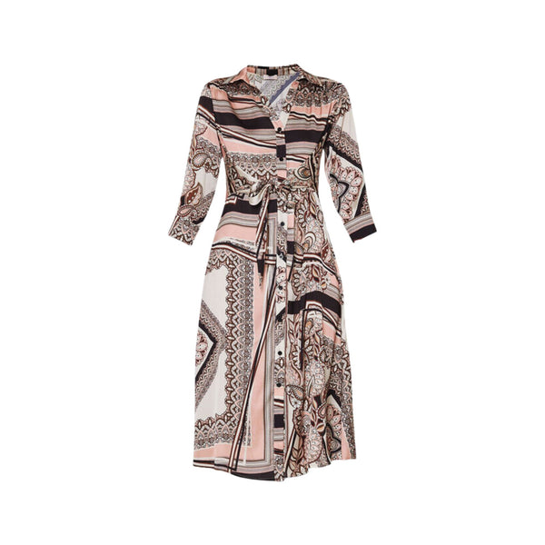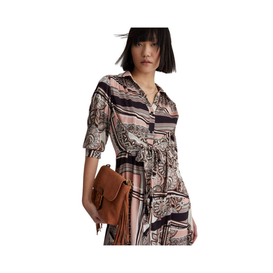 Abito da donna firmato Liu Jo modello chemisier in raso realizzato con stampa foulard all over. Il capo dispone di collo a camicia, maniche a tre quarti con bottoni al fondo e fiocco che si annoda al punto vita. Indossalo per una giornata primaverile fuori porta e mostra a tutti il tuo stile glamour. Dettagli Composizione: 100% Poliestere Vestibilità: Regular Fit Logo in metallo sul retro Fiocco che si lega in vita Chiusura con bottoni Fantasia Foulard Cod. WA3028T3450