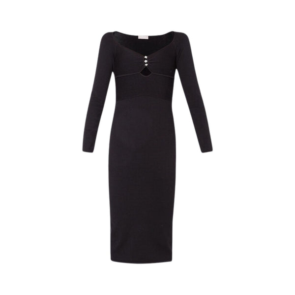 Questo Abito firmato Liu Jo in maglia di misto viscosa presenta una scollatura a cuore che evidenzia il décolleté. Le maniche lunghe offrono un look elegante e raffinato, mentre i bottoni gioiello sul davanti aggiungono un tocco di lusso. Completa il tutto il mini logo in metallo sul retro.