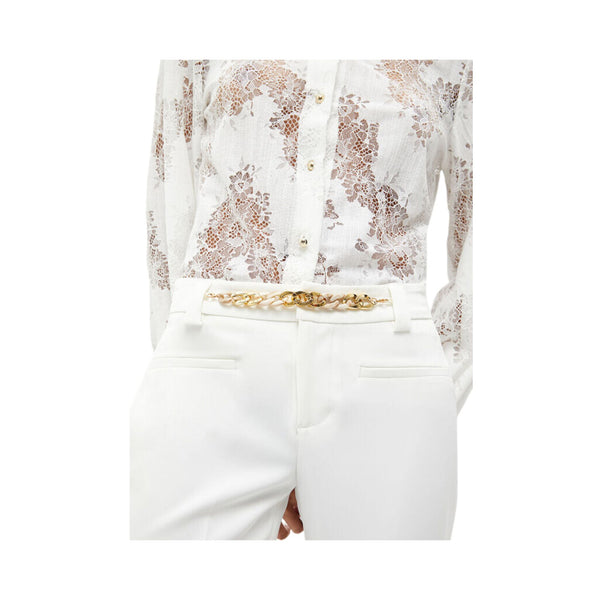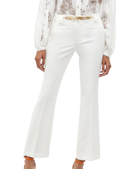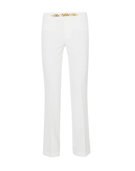 Pantaloni donna in tessuto stretch. Accessorio gioiello in metallo. Piega stirata. Gamba dritta e vestibilità cropped. Logo in metallo sul retro. Chiusura con zip nascosta e bottone. La modella è alta 178 cm e indossa la taglia 40 italiana. Composizione:88% poliestere, 12% elastan